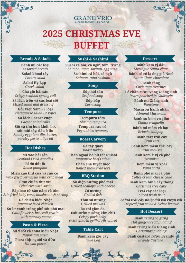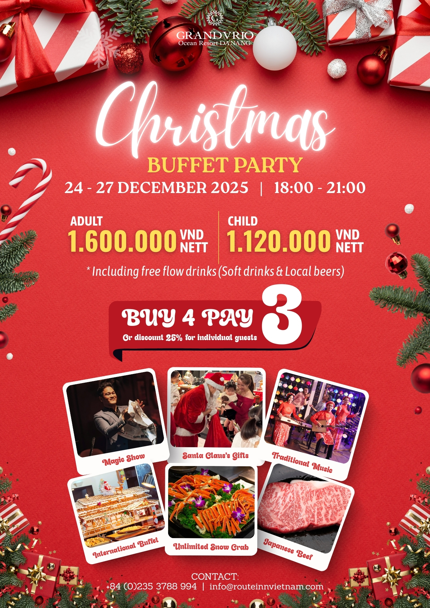 Celebrate a sparkling festive season and share warm, memorable moments with your family, friends, and loved ones at Grandvrio Ocean Resort Danang. Join us in celebrating a truly unforgettable Christmas with our elegant Christmas Buffet Dinner, filled with music and refined culinary delights:
